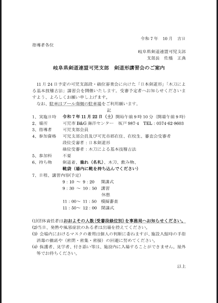 可児支部審査会に向けた形講習会のお知らせです。
