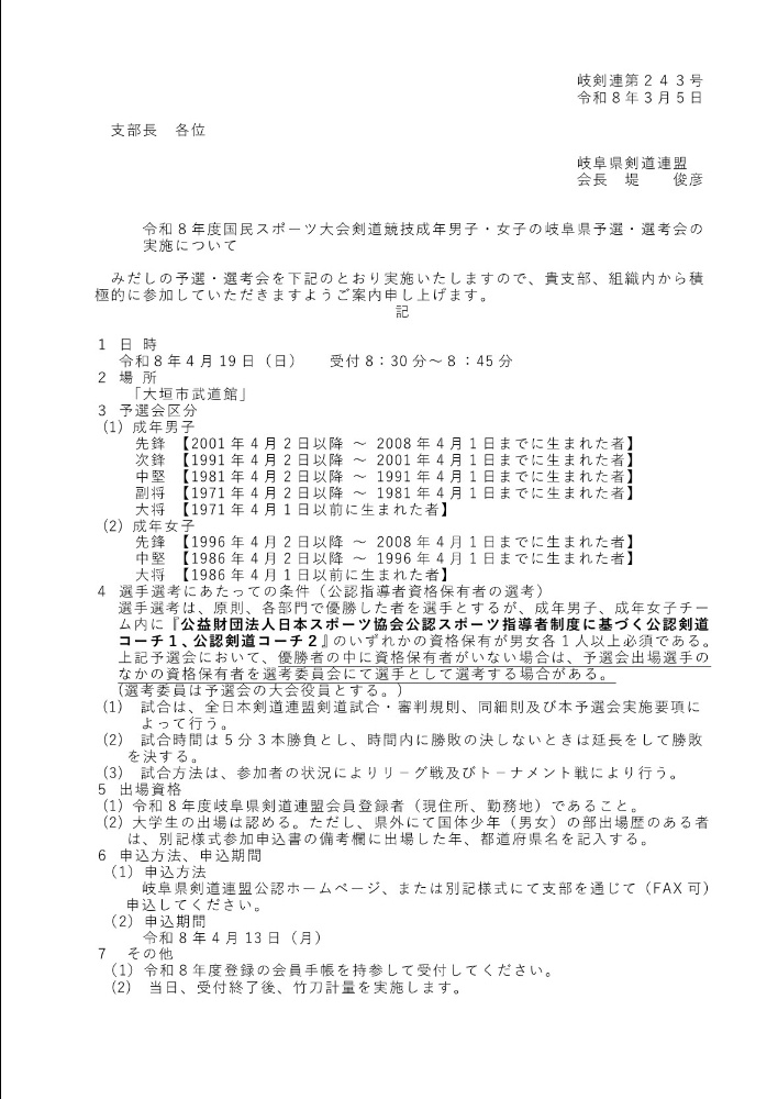 県連より、国民スポーツ大会の選考会の案内が来ております。