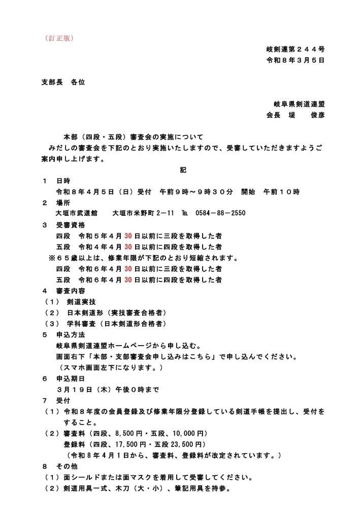 県連より春の本部審査の案内が来ております。